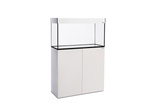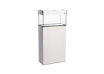 Szafki Aquatic wchodzące w skład zestawu zaprojektowano z myślą o tym, aby akwaria znajdowały się na linii wzroku. To bardzo efektowny sposób ekspozycji. Szafka została skonstruowana tak, aby w prostej i estetycznej formie połączyć wymaganą funkcjonalność z nowoczesnym designem. Podzielna konstrukcja i niepełne plecy umożliwiają łatwą organizację osprzętu i codzienne użytkowanie szafki. Od strony wizualnej najmocniejszym detalem szafki są drzwiczki działające na zasadzie „push-to open”, które po zamknięciu ukrywają blat, tworząc jedną, elegancką bryłę razem z umieszczonym na szafce zbiornikiem. Dla uzyskania efektu bryły blat został cofnięty względem przedniej krawędzi akwarium i nie pokrywa całego dna akwarium. Konstrukcja zapewnia stabilność i bezpieczeństwo użytkowania szafki.