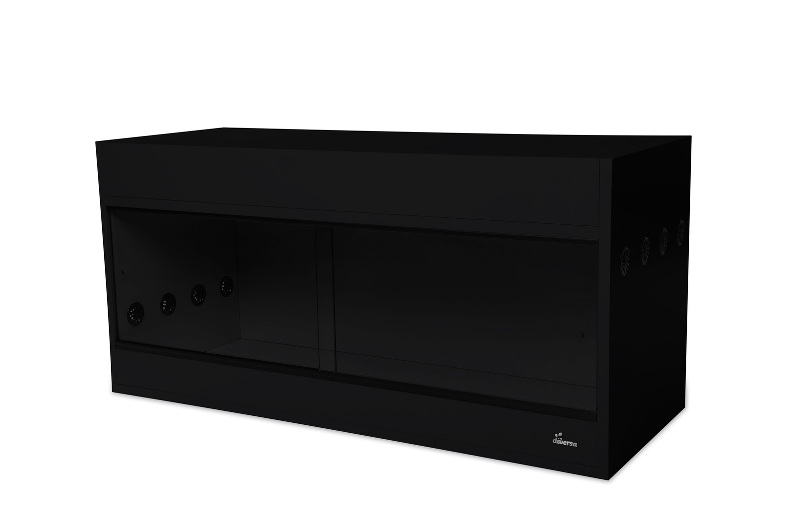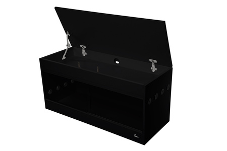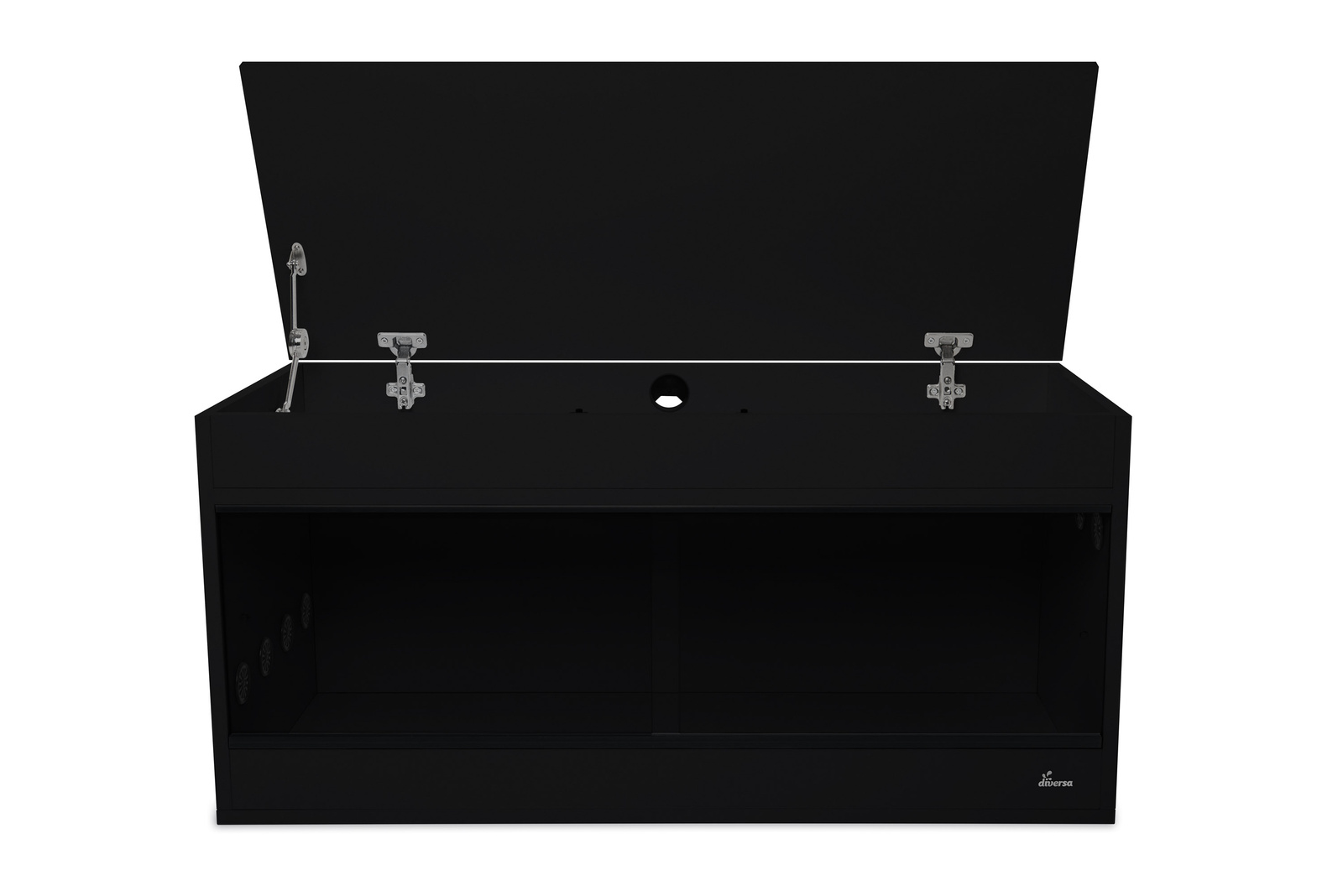 - otwierana nadstawka tworzy podwójny sufit, który służy do zamaskowania instalacji oświetlenia, może również służyć za podręczny schowek na niezbędne akcesoria. Z myślą o większej wygodzie i bezpieczeństwie korzystania z terrarium zastosowano w klapie otwieranie typu push to open oraz zawias sprzęgłowy, który po otwarciu utrzymuje ją w pozycji pionowej.