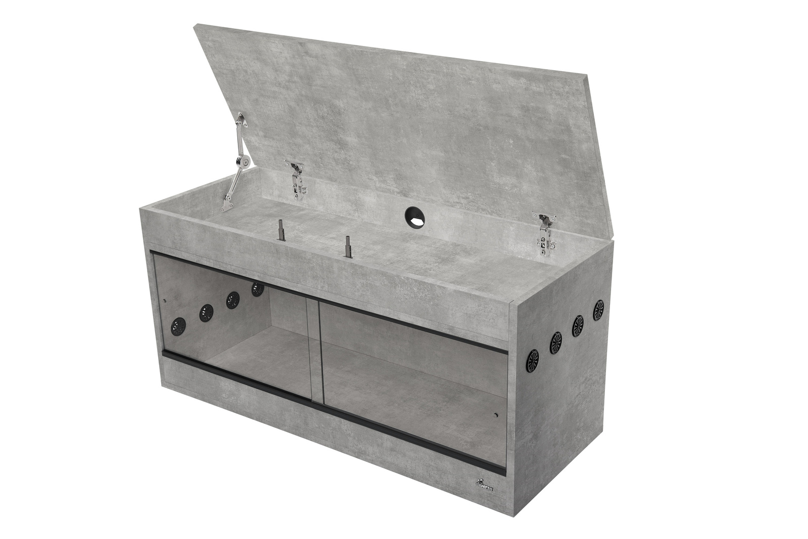 - otwierana nadstawka tworzy podwójny sufit, który służy do zamaskowania instalacji oświetlenia, może również służyć za podręczny schowek na niezbędne akcesoria. Z myślą o większej wygodzie i bezpieczeństwie korzystania z terrarium zastosowano w klapie otwieranie typu push to open oraz zawias sprzęgłowy, który po otwarciu utrzymuje ją w pozycji pionowej.